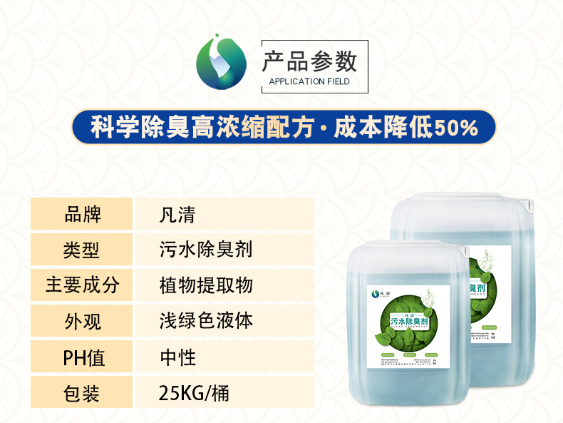 凡清復合型除臭劑,采用多種殺菌劑、防腐劑、植物提取液精心調配而成的高性能復合型除臭劑,能與各種有害、異味分子快速發生聚合、取代、置換、吸附等化學反應,使之變成無害無味分子。產品中性,無可燃性、無腐蝕性,是有效去除硫化氫、甲烷、甲硫醇、氨氣及其他揮發性有機物(VOC)等惡臭氣體凈化的環保產品。本產品無爆炸危險性,不屬易燃危險品,不屬腐蝕品,不屬毒害品。